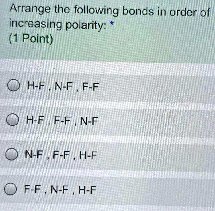 Solved Arrange The Following Bonds In Order Of Increasing Polarity 1 Point H F N F F F H Fi F F N F N F F F H F F F N F H F